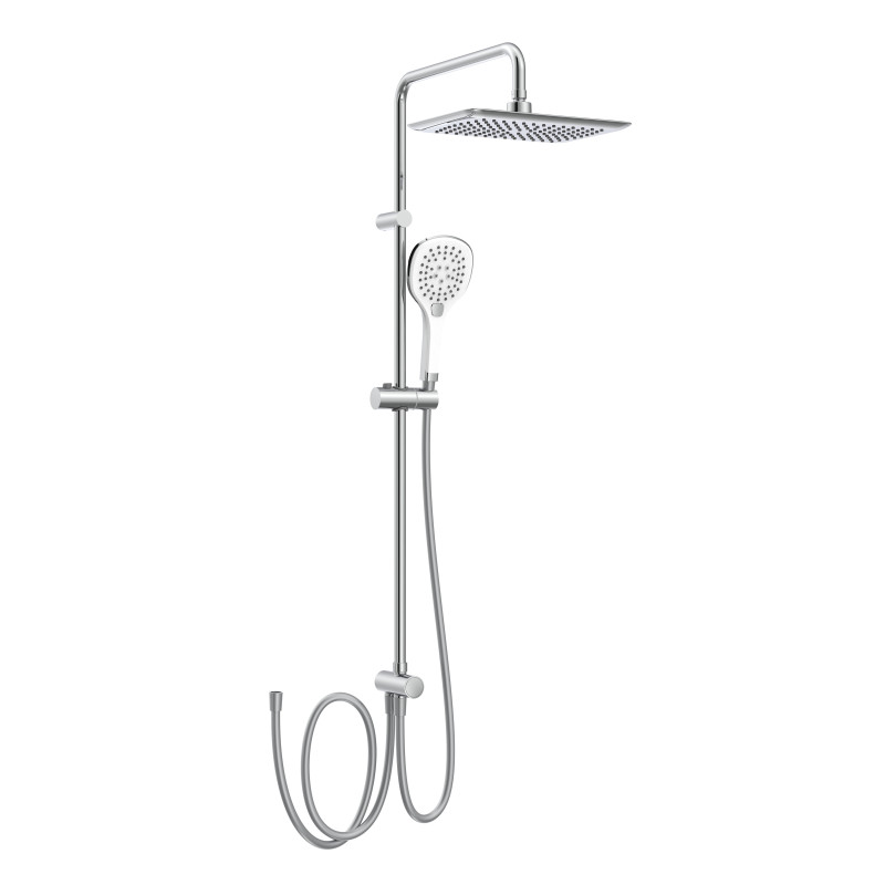 Душевая система без смесителя материал ручного душа, верхнего душа: ABS-пластик дизайн Bright Shine система без смесителя, шланг дло смесителя G1/2" 500 мм PVC, хром круглая штанга нерегулируемая 1034 мм, кронштейн 440 мм, хром регулируемый держатель лейки ручного душа на штанге овальный верхний душ 300х190 мм, крышка хром, материал форсунок LSR (мягкий силикон), Self Clean овальная лейка ручного душа SPR252, размеры 94x115 мм, крышка белый глянец, 2 типа форсунок, материал форсунок LSR (мягкий силикон), кнопочный переключатель, обратный клапан, Self Clean количество функций ручного душа: 3 количество функций верхнего душа: 1 душевой шланг 170 см, PVC, Anti Twist общий расход воды до 25 л/мин рекомендуемое давление воды: 1-5 бар