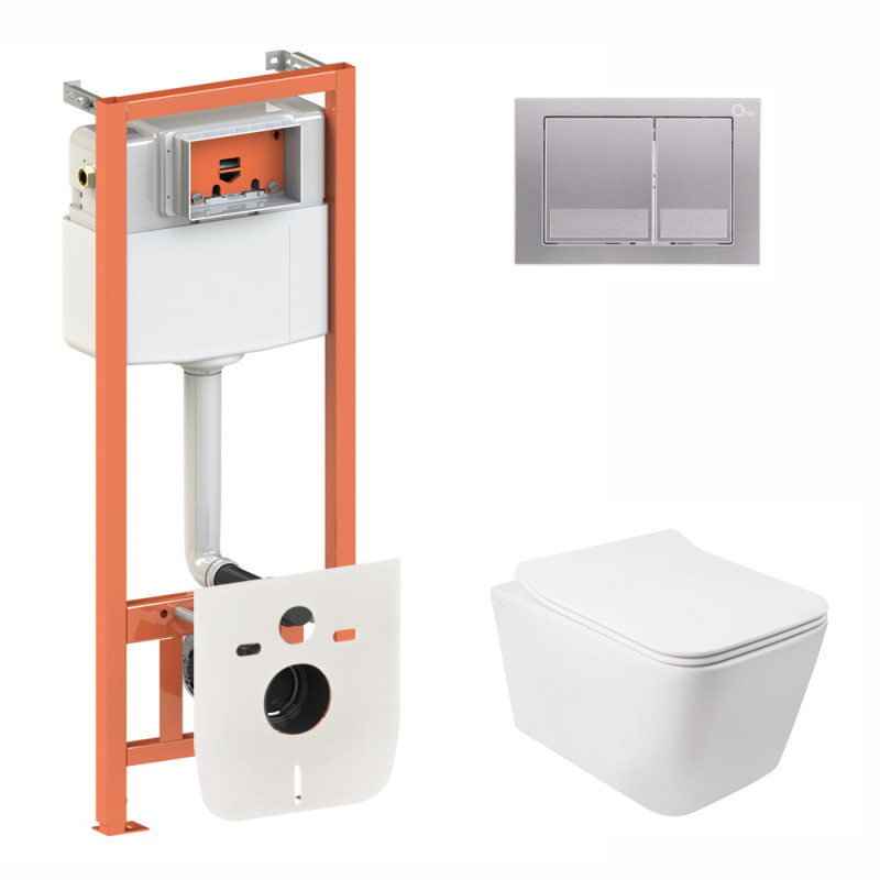 Набір Qtap інсталяція 3 в 1 Nest QT0133M425 з панеллю квадратного змиву QT0111M06029SAT + унітаз з сидінням Crow QT05335170W є зручним рішенням для сучасного санвузла. Він комплектується унітазом, сидінням, інсталяційною рамою, панеллю змиву, звукоізоляційною прокладкою. Завдяки застінному монтажу інсталяції та підвісної конструкції унітазу цей комплект зробить Ваші гігієнічні процедури комфортнішими, а прибирання не завдасть зайвого клопоту.