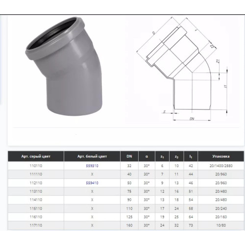 Коліно d=32 мм, кут=30 ° Сірий (170110-05)
