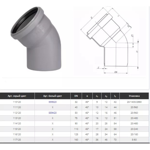 Коліно d=40 мм, кут=45 ° Сірий (171120-05)