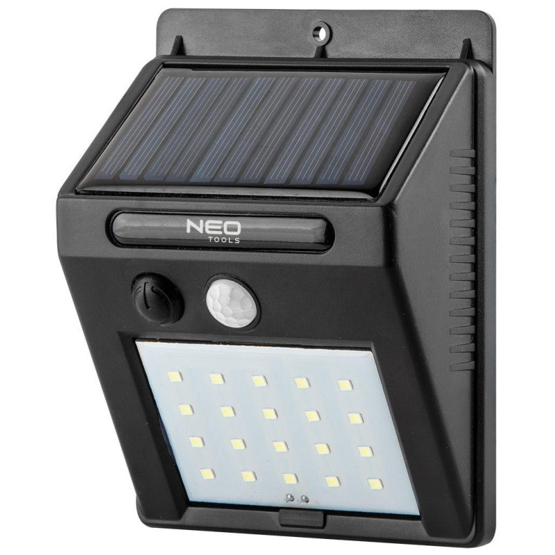 Прожектор Neo Tools, живлення від сонячного світла, 250 люмен, 1200 мАг, 3.7 Li-Ion, SMD LED, датчик руху та сутінків, IP44. Практичний та екологічний настінний світильник Neo Tools, 99-055 на сонячних батареях. Оснащений світлодіодом SMD 250 люмен. Пристрій має практичний датчик руху, що працює на відстані до 10 метрів та з кутом захоплення 120 градусів. Це дуже зручне рішення для людей, яким світло потрібне лише тоді, коли хтось знаходиться зовні. Для освітлення простору біля будинку, воріт, гаража, тераси, майстерні. Пристрій має вбудований літій-іонний акумулятор ємністю 1250 мАг і напругою 3,7 В. Для повної зарядки потрібно 5 годин і він здатний працювати на ньому ще 12 годин. Завдяки функції IC запобігає перезарядженню або розрядженню лампи. Висока якість та безпека підтверджується, зокрема, Європейський сертифікат CE. Ступінь захисту IP44.