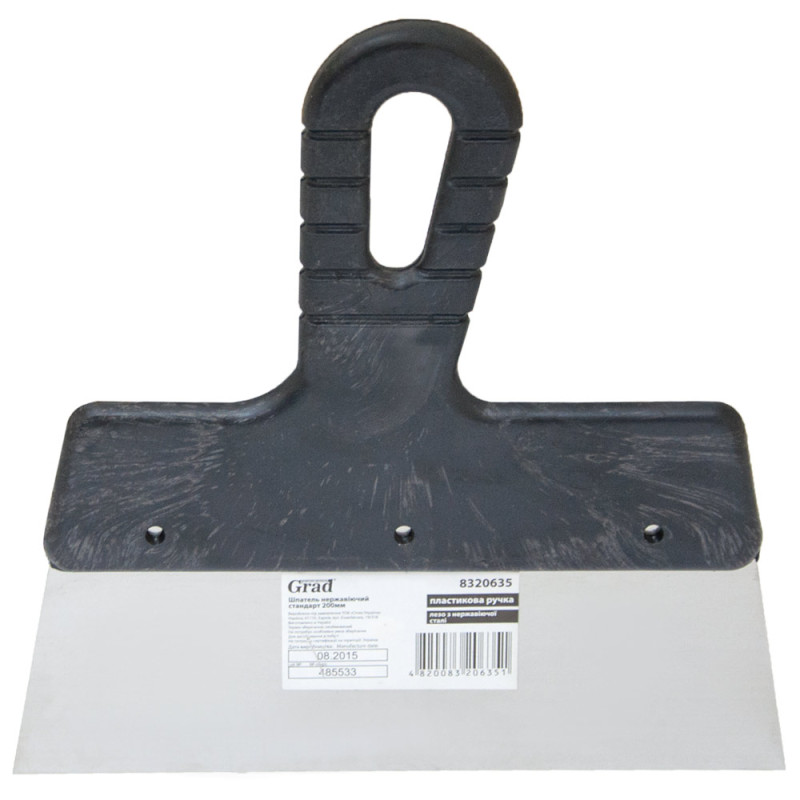 Шпатель стандарт (нержавіючий) 200мм GRAD (8320635) яке має змінну товщину для додаткової гнучкості та пружності. Інструмент оснащений пластиковою ручкою. Шпатель застосовується для оштукатурювання зовнішніх та внутрішніх стін, стель, для нанесення шпаклівок, мастик і густих клейових сумішей.