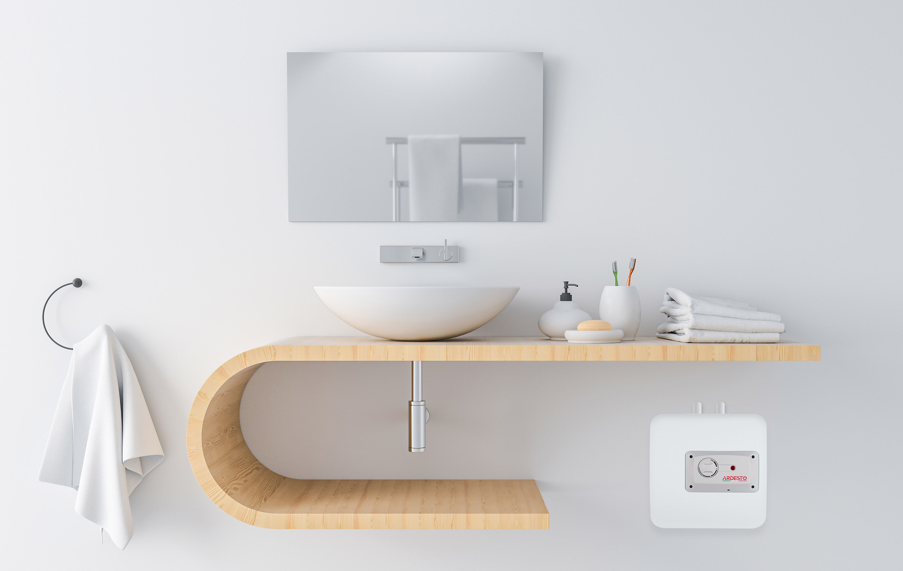 Компактний форм-факторБойлер Ardesto EWH-15UMWMI виконано у компактному форм-факторі з вертикальним монтажем під мойкою. Механічний блок керування з індикатором роботи розташовано на лицьовій панелі. Під ним передбачено під’єднання до електромережі, а для дроту живлення є отвір та захисна гофра на тильній панелі.