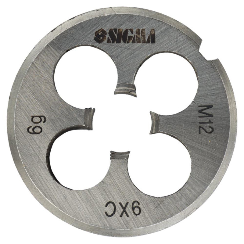 Плашка М12×1.75мм SIGMA (1604351) призначена для нарізування або калібрування зовнішніх різьб. Для роботи закріплюються в тримачах для плашок зі стопорними гвинтами. Для фіксації на зовнішньому циліндрі плашки існують конічні поглиблення і кутовий паз. При нарізанні, різьблення, попередньо, змащують консистентним мастилом.