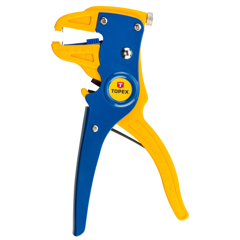 Знімач ізоляції автоматичний TOPEX довжиною 175 мм і робочим діапазоном від 0,5 мм до 6 мм². Має регулювання діапазону та зусилля натиску. Ергономічне руків’я зручно міститься в долоні, що додає комфорту під час праці. Додатково має обрізувач, що уможливлює перерізання кабелів. Марка TOPEX адресована майстрам, які займаються дрібним ремонтом.