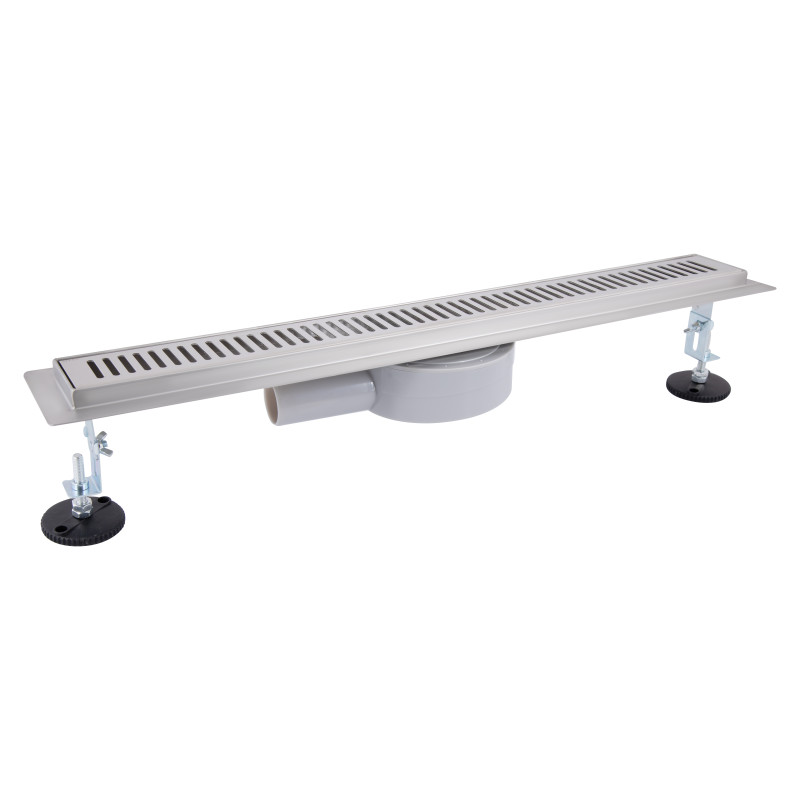 Трап, лоток сухого затвора, ґрати, ніжки (2 шт), перехідник у каналізацію 40/50 мм, гідроізоляція, гачок для ґрат.