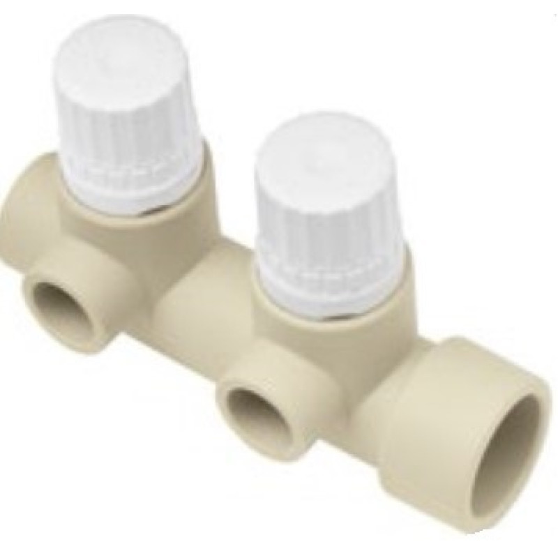 Такий колектор має два виходи, до яких під'єднуються окремі обігрівальні контури, наприклад, радіатори. На кожному виході встановлено термостатичний вентиль, який автоматично регулює потік гарячого водопостачання до радіаторів залежно від заданої температури. Це дозволяє кожній кімнаті мати індивідуальний контроль над температурою, забезпечуючи комфортний клімат в кожній кімнаті окремо.